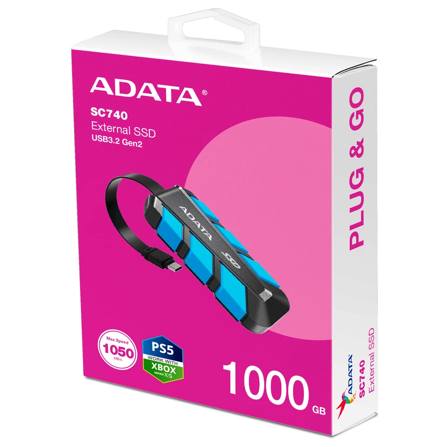 Az ADATA SC740 külső SSD tökéletes megoldást kínál azoknak, akik nagy sebességű, megbízható és hordozható tárolóeszközt keresnek. Az 1050 MB/s olvasási és 1000 MB/s írási sebességével villámgyorsan mozgathatja adatait, legyen szó nagy méretű fájlokról vagy játékokról.
