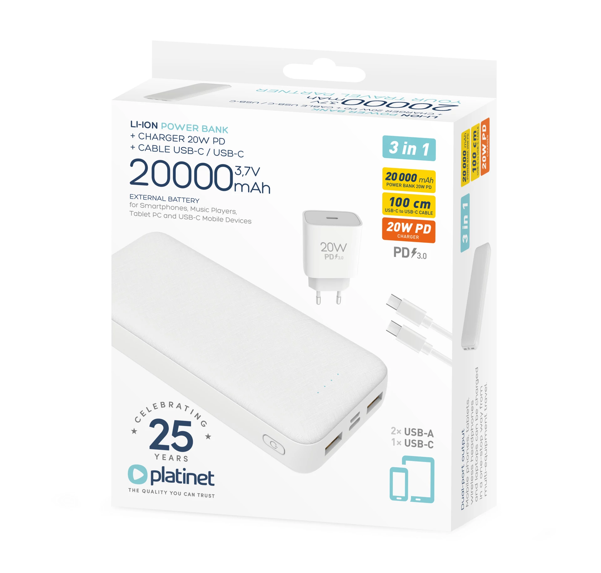 A Platinet 3 az 1-ben power bank szett mindent tartalmaz, amire szüksége lehet eszközei töltéséhez akár otthon, akár útközben. A 20000mAh kapacitású külső akkumulátor elegendő energiát biztosít több készülék többszöri feltöltéséhez, így soha nem marad energia nélkül.