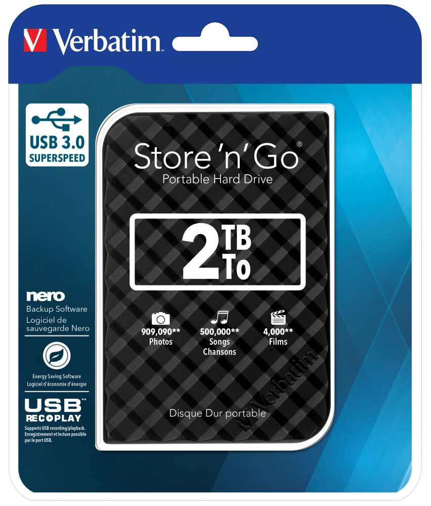 A Verbatim Store 'n' Go 2TB külső merevlemez ideális választás mindazoknak, akik nagy mennyiségű adatot szeretnének magukkal vinni. A kompakt 2,5 colos kivitelnek köszönhetően könnyen hordozható, miközben 2TB tárolókapacitást biztosít dokumentumok, fényképek, zenék és filmek számára.